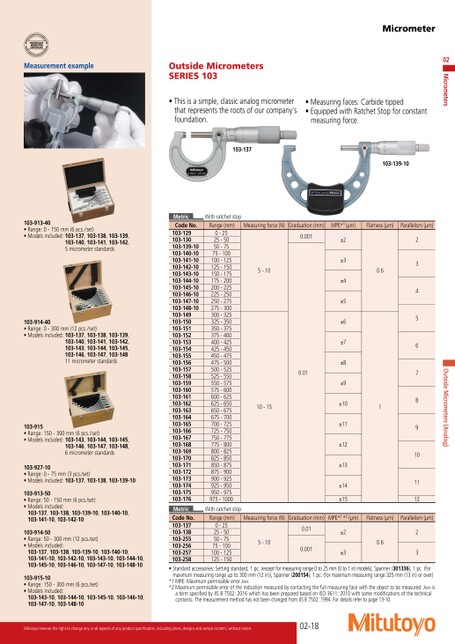 •Thisisasimple,classicanalogmicrometerthatrepresentstherootsofourcompany’sfoundation.•Measuringfaces:Carbidetipped•EquippedwithRatchetStopforconstantmeasuringforce.103-137103-139-10OutsideMicrometers(Analog)234567891011120.61±2±3±4±5±6±7±8±9±10±11±12±13±14±150.0010.015-1010-150-2525-5050-7575-100100-125125-150150-175175-200200-225225-250250-275275-300300-325325-350350-375375-400400-425425-450450-475475-500500-525525-550550-575575-600600-625625-650650-675675-700700-725725-750750-775775-800800-825825-850850-875875-900900-925925-950950-975975-1000WithratchetstopRange(mm)Measuringforce(N)Graduation(mm)MPE*1(μm)Flatness(μm)Parallelism(μm)WithratchetstopRange(mm)Measuringforce(N)Graduation(mm)MPE*1*2(μm)Flatness(μm)Parallelism(μm)0-2525-5050-7575-100100-125125-1505-100.010.001±2±30.623MetricCodeNo.103-129103-130103-139-10103-140-10103-141-10103-142-10103-143-10103-144-10103-145-10103-146-10103-147-10103-148-10103-149103-150103-151103-152103-153103-154103-155103-156103-157103-158103-159103-160103-161103-162103-163103-164103-165103-166103-167103-168103-169103-170103-171103-172103-173103-174103-175103-176MetricCodeNo.103-137103-138103-255103-256103-257103-258•Standardaccessories:Settingstandard,1pc.(exceptformeasuringrange0to25mm(0to1in)models),Spanner(301336),1pc.(formaximummeasuringrangeupto300mm(12in)),Spanner(200154),1pc.(formaximummeasuringrange325mm(13in)orover)*1MPE:MaximumpermissibleerrorJMPE*2Maximumpermissibleerroroftheindicationmeasuredbycontactingthefullmeasuringfacewiththeobjecttobemeasured.JMPEisatermspecifiedbyJISB7502:2016whichhasbeenpreparedbasedonISO3611:2010withsomemodificationsofthetechnicalcontents.ThemeasurementmethodhasnotbeenchangedfromJISB7502:1994.Fordetailsrefertopage13-10.02-18103-913-40•Range:0-150mm(6pcs./set)•Modelsincluded:103-137,103-138,103-139,103-140,103-141,103-142,5micrometerstandards103-914-40•Range:0-300mm(12pcs./set)•Modelsincluded:103-137,103-138,103-139,103-140,103-141,103-142,103-143,103-144,103-145,103-146,103-147,103-14811micrometerstandards103-915•Range:150-300mm(6pcs./set)•Modelsincluded:103-143,103-144,103-145,103-146,103-147,103-148,6micrometerstandards103-927-10•Range:0-75mm(3pcs./set)•Modelsincluded:103-137,103-138,103-139-10103-913-50•Range:50-150mm(6pcs./set)•Modelsincluded:103-137,103-138,103-139-10,103-140-10,103-141-10,103-142-10103-914-50•Range:50-300mm(12pcs./set)•Modelsincluded:103-137,103-138,103-139-10,103-140-10,103-141-10,103-142-10,103-143-10,103-144-10,103-145-10,103-146-10,103-147-10,103-148-10103-915-10•Range:150-300mm(6pcs./set)•Modelsincluded:103-143-10,103-144-10,103-145-10,103-146-10,103-147-10,103-148-10MeasurementexampleOutsideMicrometersSERIES103