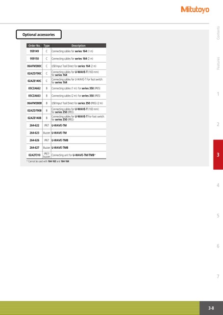 OptionalaccessoriesOrderNo.TypeDescription95914995915006AFM380C02AZD790C02AZE140C05CZA66205CZA66306AFM380B02AZD790B02AZE140BCCCCCBBBBBConnectingcablesforseries164(1m)Connectingcablesforseries164(2m)USBInputToolDirectforseries164(2m)ConnectingcablesforU-WAVE-T(160mm):forseries164ConnectingcablesforU-WAVE-TForfootswitch:forseries164Connectingcables(1m):forseries350(IP65)Connectingcables(2m):forseries350(IP65)USBInputToolDirectforseries350(IP65)(2m)ConnectingcablesforU-WAVE-T(160mm):forseries350(IP65)ConnectingcablesforU-WAVE-TForfootswitch:forseries350(IP65)264-622IP67U-WAVE-TM264-623BuzzerU-WAVE-TM264-626IP67U-WAVE-TMB264-627BuzzerU-WAVE-TMB02AZF310IP67/buzzerConnectingunitforU-WAVE-TM/TMB**Cannotbeusedwith164-163and164-1643-8