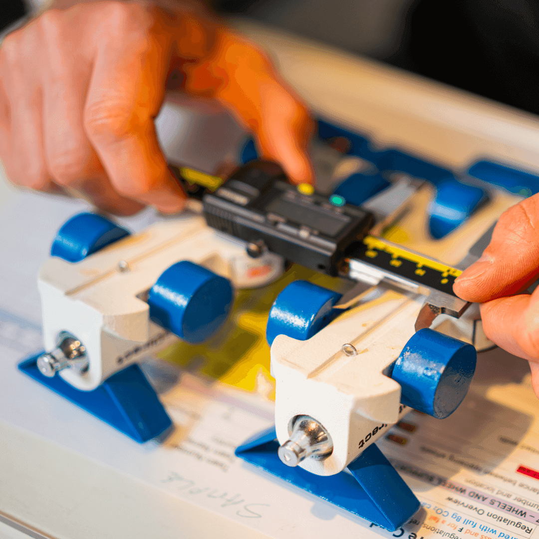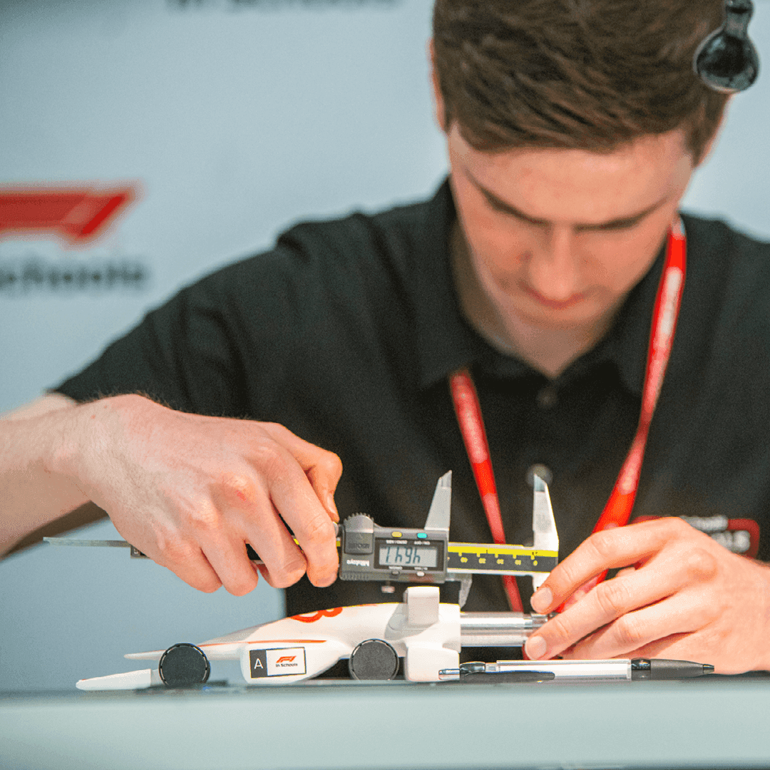 Scrutineering being completed using Mitutoyo measuring equipment at the Aramco 2022 F1 in Schools World Finals